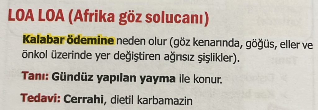 Loa loa geyik sineği ya da Mango sineği ile bulaşır, konjonktiva altında hareketli kalabar şişliğine neden