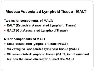 Mukoza ile ilişkili lenf dokusu olarak da adlandırılan mukoza ile ilişkili lenfoid doku ( MALT ) , gastrointestinal sistem , nazofarenks , tiroid , meme gibi vücudun çeşitli submukozal membran bölgelerinde bulunan küçük konsantrasyonlarda lenfoid dokudan oluşan diffüz bir sistemdir. Akciğer , tükürük bezleri , göz ve deri . MALT, T hücreleri ve B hücreleri gibi lenfositlerin yanı sıra plazma hücreleri tarafından doldurulur ve her biri mukozal epitelden geçen antijenlerle karşılaşmak için iyi konumlanmış makrofajlar. Bağırsak MALT durumunda, antijeni lümenden örnekleyen ve onu lenfoid dokuya ileten M hücreleri de mevcuttur. MALT, insan vücudundaki lenfoid dokunun yaklaşık %50’sini oluşturur. Mukoza zarlarında meydana gelen bağışıklık tepkileri , mukozal immünoloji tarafından incelenir .