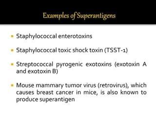 Örnekler; Toxic shock syndrome toxin-1 (TSST-1), Streptococcal pyrogenic exotoxins (SPE), Staphylococcal enterotoxins (SE), enterotoxogenic E. coli (ETEC) enterotoxin.