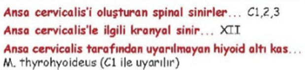 Ansa cervicalis’den çıkan dallar; m. Thyrohyoideus hariç, hiyoid altı kasları yani m. sternothyroideus, m. sternohyoideus ve m. omohyoideusu uyarır.