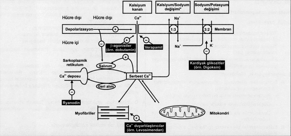 1. Na-K-ATPaz pompasını (bu pompa 3 Na atılmasına karşılık 2 K’u hücreye sokar) inhibe edip intrasellüler Ca düzeyini arttırarak gösterirler.