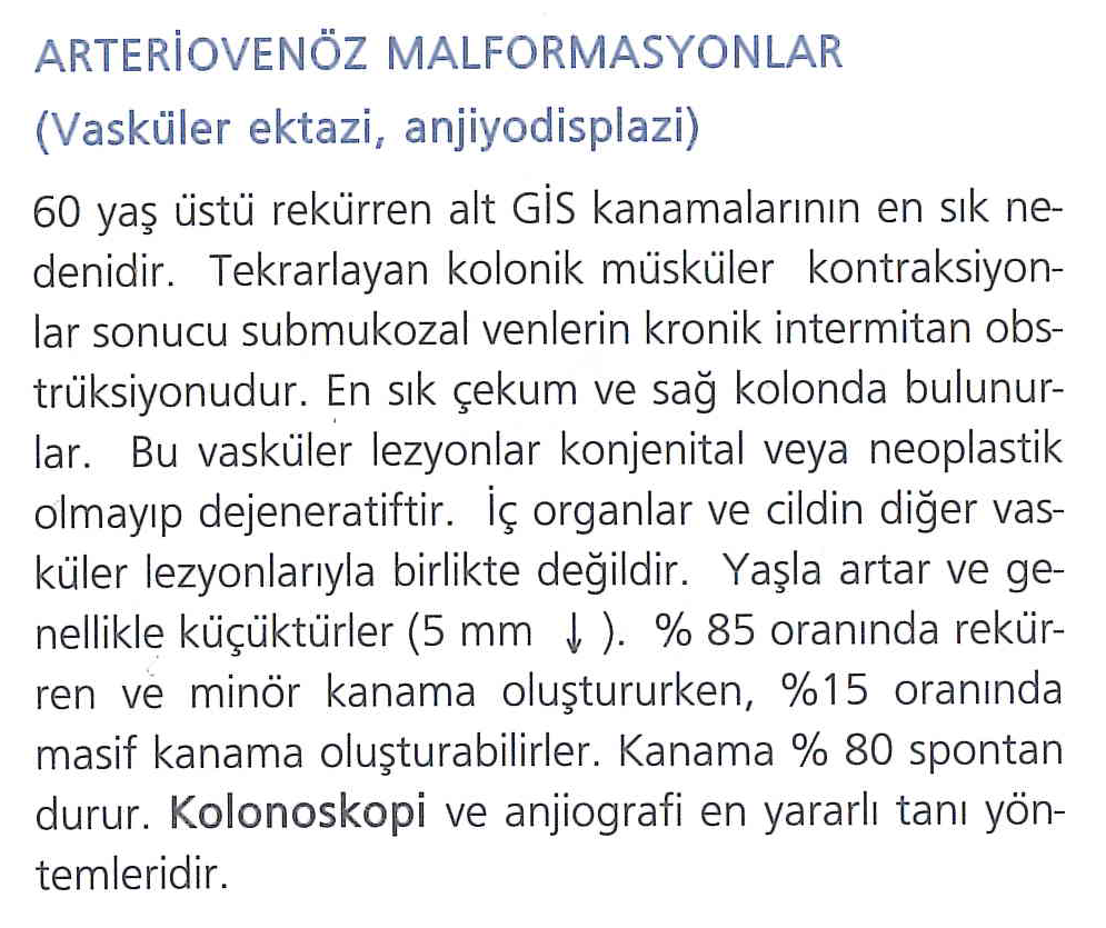 Orjini bilinmeyen gastrointestinal sistem kanamalarının %30-40’ını ince barsak anjiodisplazileri oluşturur. Kalın barsakta ise en sık çekum ve sağ kolonda izlenmektedir.