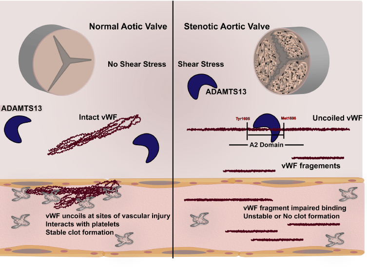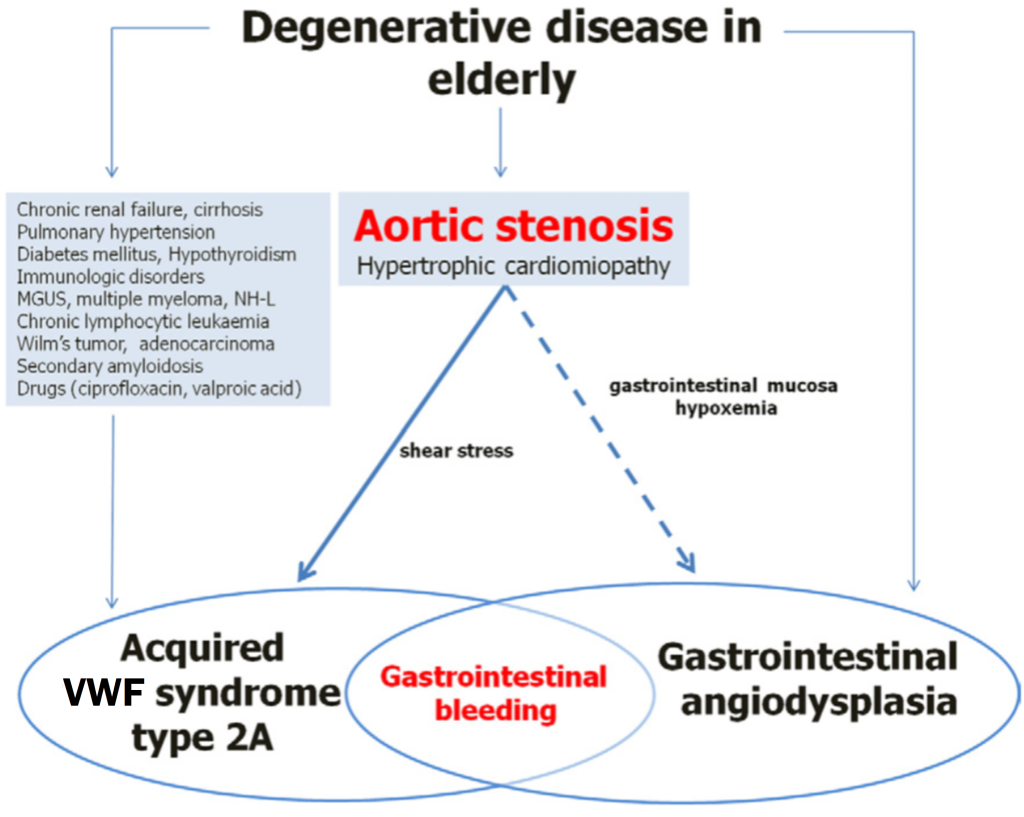 Bu bozuklukta, aort kapağı etrafındaki yüksek türbülanslı kan akışındaki yüksek kayma gerilimi nedeniyle von Willebrand faktörü (vWF) proteolize edilir. vWF, anjiyodisplaziler de dahil olmak üzere yüksek kesme gerilimi olan vasküler yataklarda en aktiftir ve vWF eksikliği bu tür lezyonlardan kanama riskini artırır.