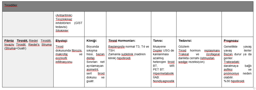 Tiroidde, çevre dokulara da ilerleyen fibrozis görülür. Tiroid sert ve fiksedir. Sebebi bilinmiyor. Retroperitonda, orbitada, mediastende de tiroiddekine eşlik eden fibrozis görülebilir.