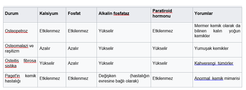 Yüksek serum alkalen fosfataz (telafi edici osteoblast aktivitesindeki artışa bağlı olarak )