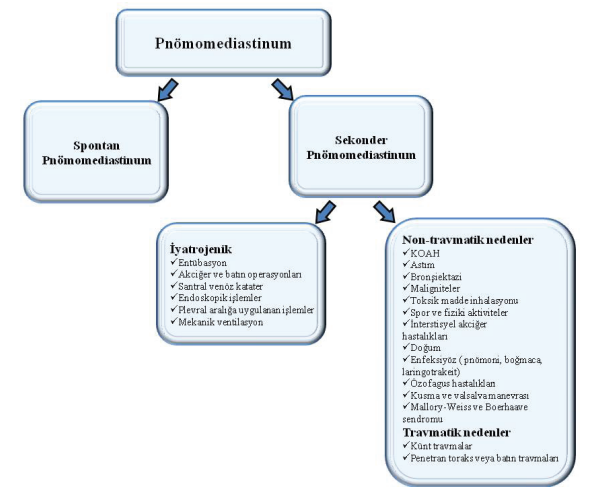 Macklin ve ark.’ının çalışmasında PM oluşmasında; alveolarinterstisyum basınç gradienti sebebiyle, alveoler basınçtaki artış, havanın perivasküler ve peribronşiyal kılıflar boyunca mediastene geçiş yapması öne sürülür. Pnömomediastinum; spontan (SPM) ve sekonder olarak iki grupta sınıflandırılır