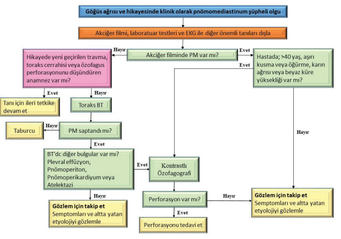 Ayrıca, Toraks BT ile, akciğer grafi sinde saptanamayan pnömotoraks, pnömoperikardiyum ve cilt altı amfizeminin şiddeti değerlendirilir. Göğüs cerrahi kliniğimizde pnömomediastinum şüpheli olgularda çoğunlukla etyolojiyi ve tanıyı doğrulamak amaçlı Toraks BT tercih ediyoruz. Pnömomediastinum olgularında ultrason (USG), kaza ve acil durumlarda tercih edilebilir(1). Bronkoskopi ve özofagoskopi rutinde uygulanmayıp, altta yatan şüpheli bir anamnez ve hikaye varlığında, tanıyı doğrulamak amaçlı yapılabilir. Hastanın hikayesinde geçirilmiş akciğer enfeksiyonları, maligniteler, bronşiektazi, özofagus motilite bozuklukları, peptik ülser, gastrit ve kronik alkol kullanımının olması olası hava yolu rüptürü veya özofagus perforasyonu riski oluşturabileceği akılda tutularak girişimsel endoskopik işlemler tercih edilebilir. Yüksek rezolüsyonlu toraks BT (HRCT), özofagus perforasyon şüphesi olan vakalarda kullanılabilir. Rutin olarak önerilmez.