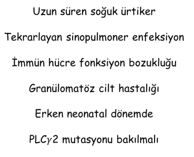 Bu durum soğuğa bağlı ürtiker , otoimmünite , atopi ve hümoral immün yetmezlik ile karakterizedir . Humeral immün yetmezlik tekrarlayan bronkopulmoner enfeksiyonlara neden olur. Kutanöz granülomlar da oluşabilir.