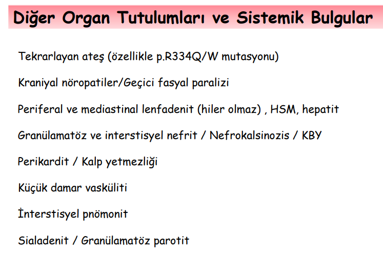 Tanı; klinik bulgular, genetik analiz ve histolojik incelemenin kombinasyonuna dayandırılarak konulur. Tedavide kortikosteroidler, immünsüpresifler ve biyolojik ajanlar faydalı bulunmuştur.