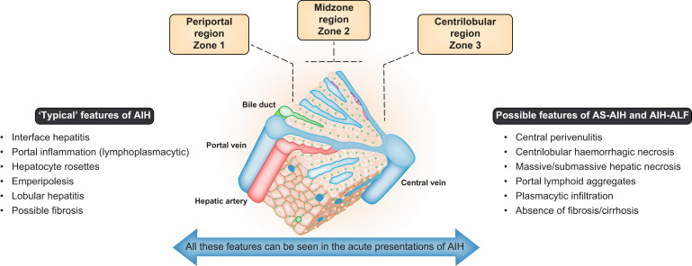 Akut karaciğer yetmezliğinin (ALF) çoğunda, santrizonal dağılımda başlayan ve portal yollara doğru ilerleyen yaygın hepatoselüler nekroz vardır . Parankimal inflamasyonun derecesi değişkendir ve hastalığın süresi ile orantılıdır .