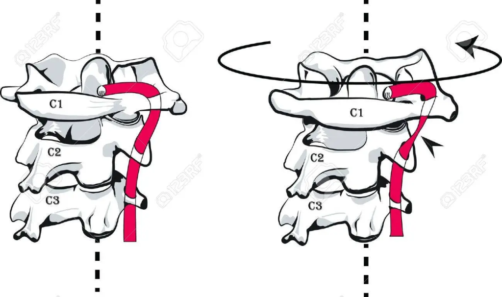 B. C1-C2 düzeyinde baş rotasyonu ile vertebral arterin mekanik oklüzyonudur. ***
