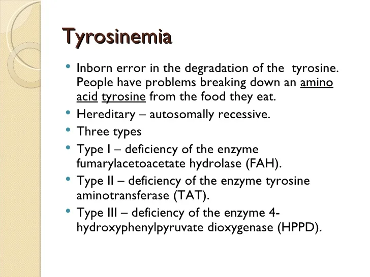 Tirozinemi tip I otozomal resesif geçişli hastalıktır. Fumarilasetoasetat hidrolaz enziminin eksikliği sonucu tirozinin orta derecede artmasıyla