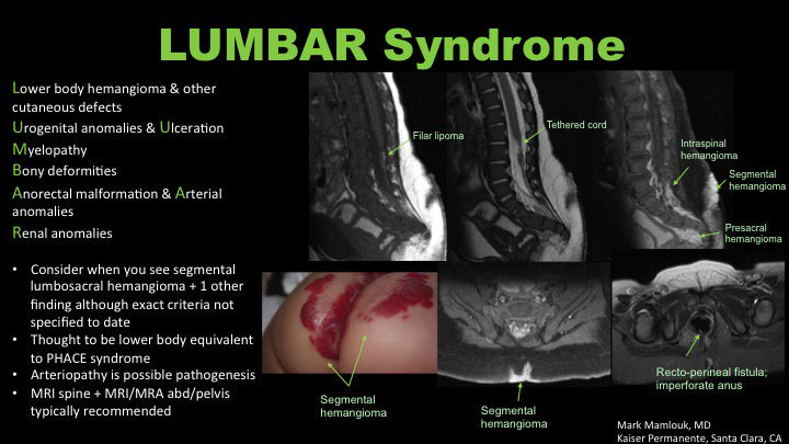 LUMBAR sendromu (alt vücut konjenital infantil hemanjiyomları ve diğer cilt kusurları; ürogenital anomaliler ve ülserasyon; miyelopati; kemik deformiteleri; anorektal malformasyonlar ve arteriyel anomaliler; ve rektal anomaliler), vücudun alt yarısının infantil hemanjiyomları ile bölgesel konjenital arasında nadir görülen bir ilişkidir.
