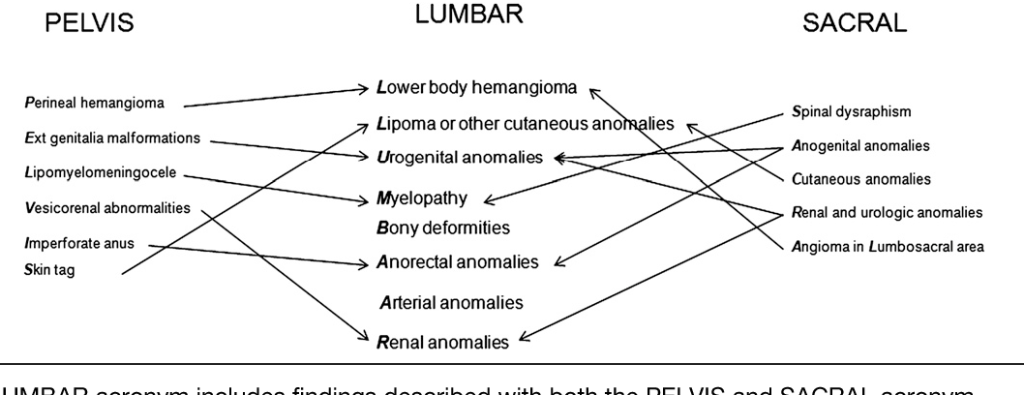LUMBAR is the acronym for Lower body hemangioma**, Urogenital abnormalities / ulceration, Myelopathy, Bony deformities, Anorectal malformations / arterial anomalies, Rectal anomalies.
