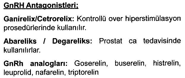 | Goserelin | Meme kanseri; Endometriozis; Kadın kısırlığı (yardımlı üreme); Prostat kanseri; Rahim hastalıkları (endometrial inceltici ajan); rahim fibroidleri; rahim kanaması |