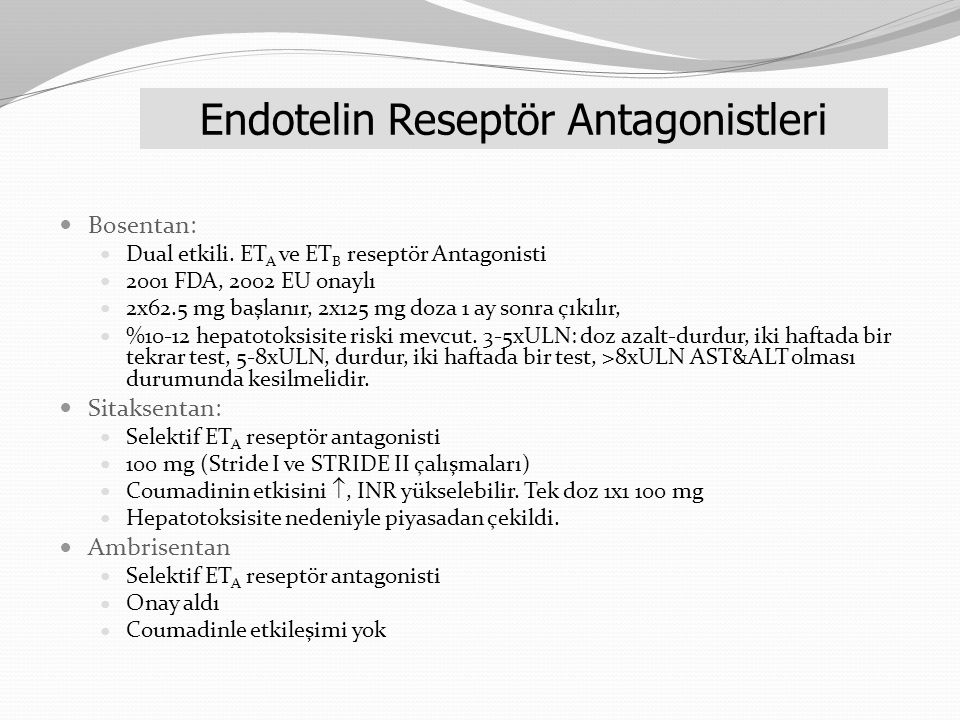 2-Ambrisentan, sitaksentan, masitentan, ETA reseptörlerini selektif inhibe ederek aynı endikasyonda kullanılır.