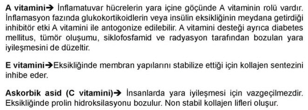 Vitamin A, Yara iyileşmesinin tüm aşamalarında önemli bir rol oynar . A vitamini, epitel büyümesini, fibroblastları, granülasyon dokusunu, anjiyogenezi, kollajen sentezini, epitelizasyonu ve fibroplaziyi uyarma kabiliyeti ile bilinir.