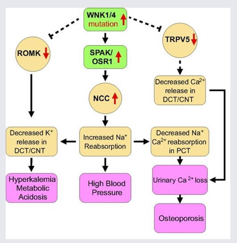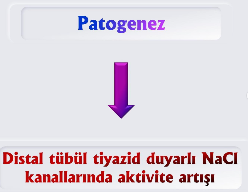 wnk1 ve wnk4 mutasyonu olur, distal tübüldeki nacl cotransporterı coşar, çok emilen sodyum volüm genişletir hipertansiyon yapar. Renin düşer.