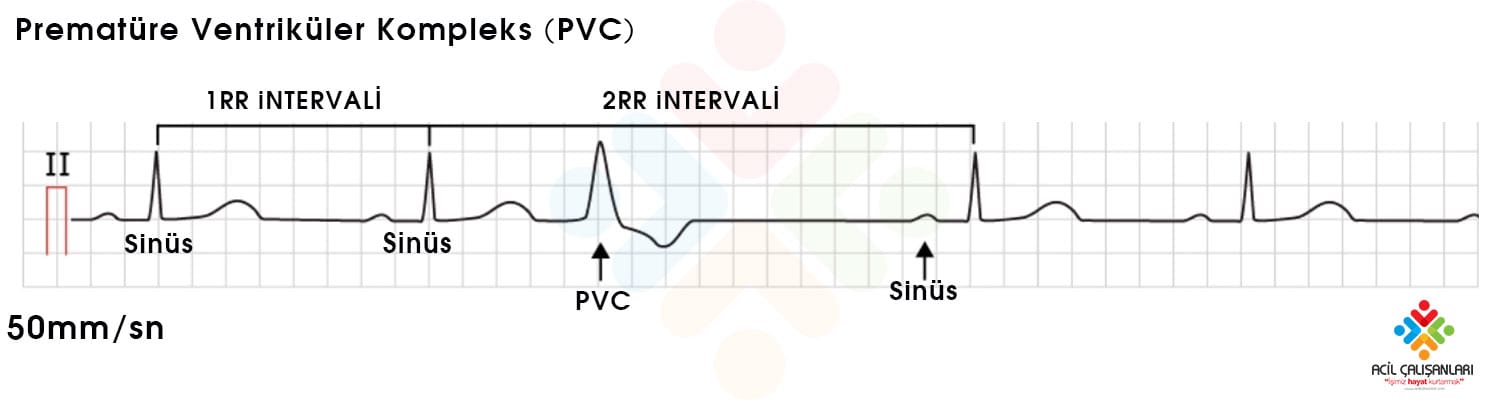 Prematüre Ventriküler Kompleks; ritim belli bir periyotta giderken, ventriküllerdeki ektopik bir veya birkaç odaktan erken uyarı gelmesi durumudur. Erken gelen ventriküler uyarı nedeni ile oluşan QRS kompleksi normal QRS komplekslerine benzemez geniş morfolojili QRS kompleksinin amplitüdü büyük olup, önünde P dalgası bulunmaz. Ventrikül kaynaklı bu erken vurular belirli bir düzenle gelebileceği gibi rastgele aralıklarla da gelebilir. Ard arda PVC gelmesi ventrikül taşikardisine zemin hazırlayabilir.