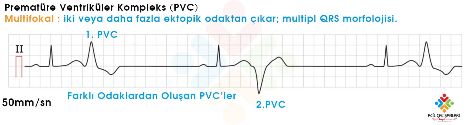 Multifokal PVC EKG’sinde görülen erken vuruların kaynağı ventriküllerdeki birden fazla farklı ektopik odaklardan kaynaklanmaktadır. Bu nedenle aynı derivasyondaki PVC atımları birbirinden farklıdır.