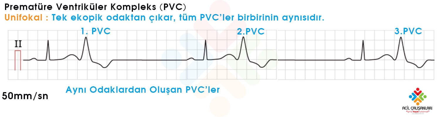 Unifokal PVC lerde EKG’sinde görülen erken vurular aynı ektopik odakdan kaynaklanır. Bu nedenle aynı derivasyondaki tüm PVC atımları birbirine benzer