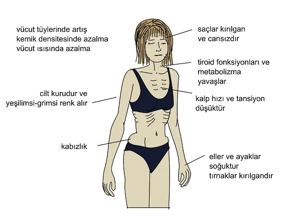 Bu hastalar genel olarak ince ve kaşektik görünümdedirler. Vital bulgularında hipotansiyon, hipotermi; ciltte lanugo tüyleri, parmaklarda kendini kusturmaya bağlı olarak cilt derisinde kalınlaşma ve sertleşme, deride ve saçlarda kuruluk, kalpte bradikardi ve mitral kapak prolapsusu, batında skafoid karın ve palpe edilebilir barsak ansları, memelerde atrofi, vajinal mukozada hipoöstrojenizasyona bağlı olarak kuruluk, ağız ve dişlerde çürük görülebilir