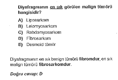 Diyafram tümörleri çok nadir görülen tümörlerdir. En sık rastlanan selim tümörü lipom, malign tümörü ise fibrosarkomdur.