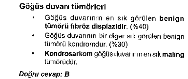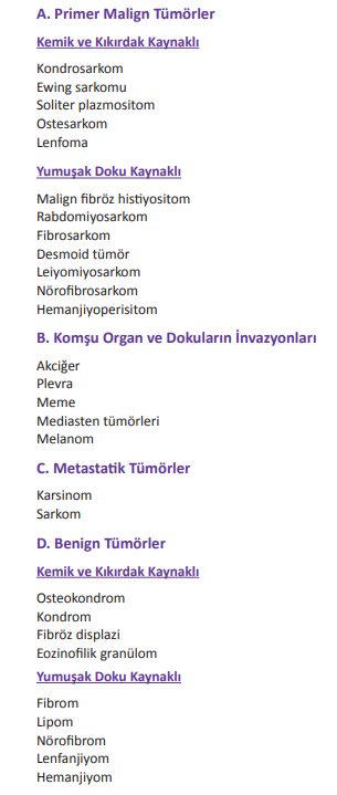 En sık görülen göğüs duvarı primer benign yumuşak doku tümörleri fibromlar, lipomlar, dev hücreli tümör, hemanjiomlar, nörojenik tümörler,desmoid tümörlerdir.