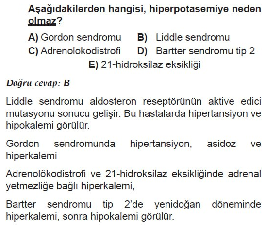 Liddle sendromu ile bartter sendromu arasındaki farklar nelerdir… Liddle sendromunda renin ve aldesteron normalken soydum tutulumuna bağlı hipertansiyon beklenirken , bartter sendromunda hiperreninemik hiperaldesteronizm omasına rağmen böbrekten sodyum kaybına bağlı olarak hipertansiyon beklenmez.