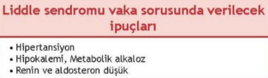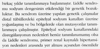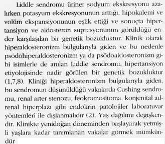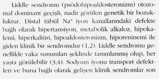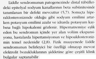 Liddle sendromu üriner sodyum ekskresyonu aza- lirken potasyum ekskresyonunun arttığı, hipokalemi ve volüm ekspansiyonunun eşlik ettiği ve sonuçta hiper- tansiyon ve aldosteron supresyonunun görüldüğü en- der karşılaşılan bir genetik bozukluktur.
