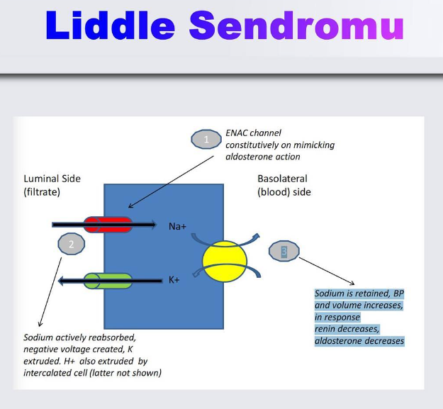 Liddle sendromu: Distal tübül ve toplayıcı kanallardaki amilorid duyarlı epitelyal sodyum kanallarında (ENaC) aşırı çalışmaya neden olan bir mutasyon bulunur. Bu durumda, aşırı Na+ tutulumuna bağlı hipertansiyona, hipokalemiye ve metabolik alkaloza neden olur. Renin ve aldesteron düzeyi normal veya düşüktür.