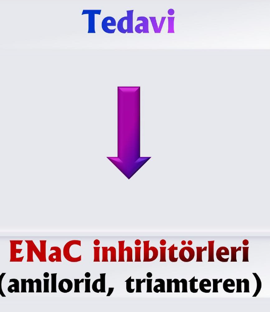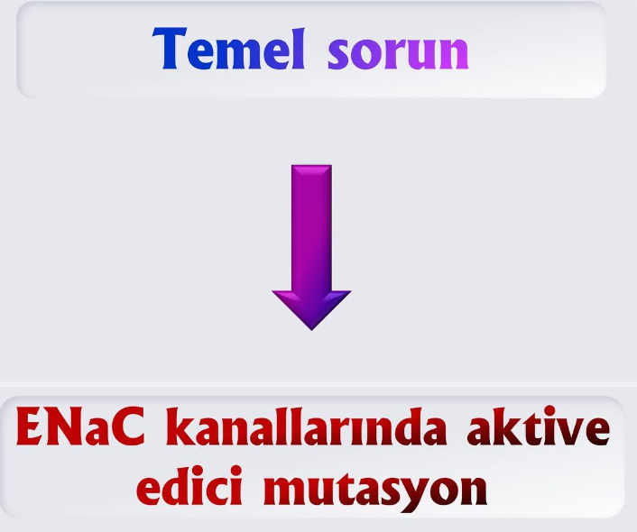 Yanı amilorid ile tedavi edilince, ortadan kalkan hipertansiyon ile konur çünkü amilorid bu kanalı inhibe edebilmektedir, aynı zamanda tedavisidir.