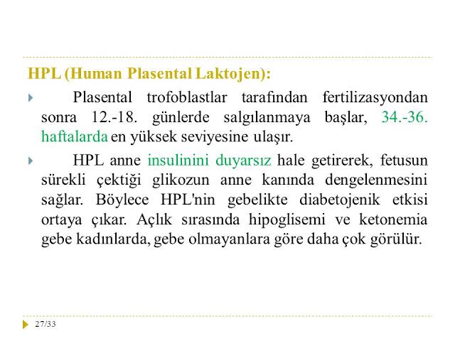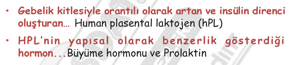 İnsan Plasental Laktojen (hPL), anne için laktasyon hazırlığı yapar, maternal glikozu, protein ve yağ seviylerini fetüse göre düzenler. Seviyesi plsentanın boyutunu arttırır. Östrojen, hamile olmayan kadınlara göre 3 kat fazla salgılanır. Göğüs, uterusun genişlemesine neden olur.