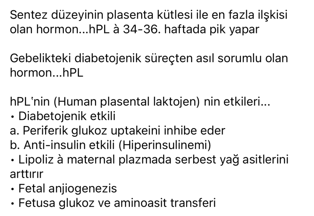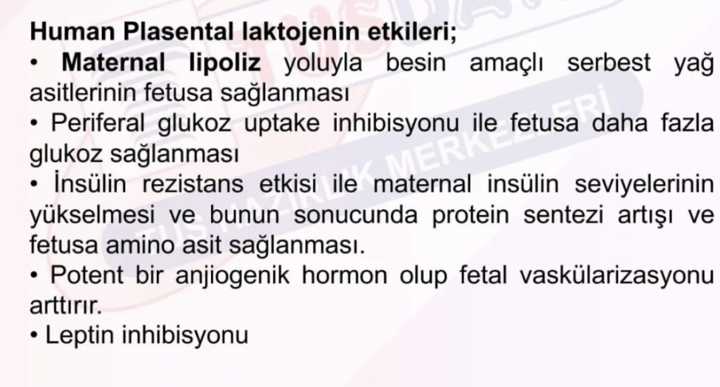 Plasentadaki Human Plasental Laktojen (HPL) yapımı ise sinsityotrofoblastların majör metabolik biosentez aktivitelerinden biri olarak gösterilebilir. HPL’nin tibia epifiz gelişimi, vücut ağırlık artışı ve kostal kıkırdakta sülfat uptake’ı gibi growth hora mon benzeri aktiviteleri vardır.