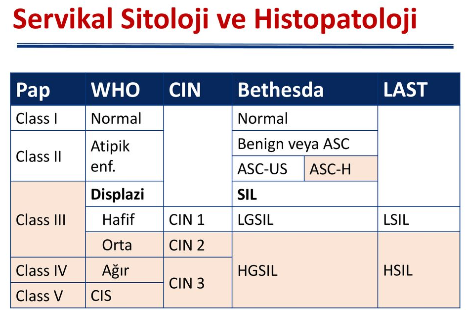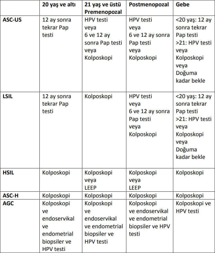 V-AGC “Atypical glandular cells”; Kolposkopi eşliğinde servikal biyopsi + ECC (veya LEEP) + Endometriyal biyopsi