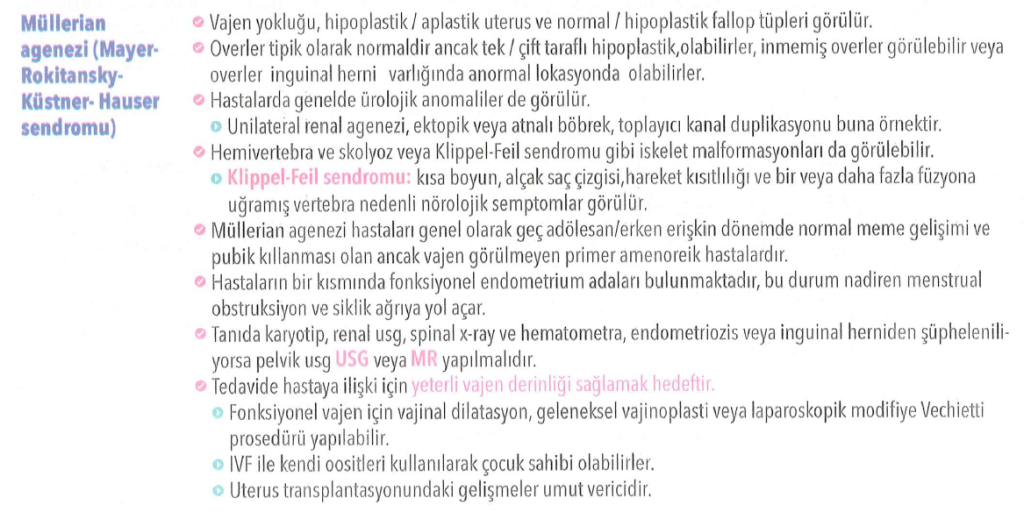 Etiyolojisi tam olarak bilinmemektedir. Genellikle sporadik geçişlidir ve eşlik eden anomaliler; servikotorasik vertebral defektler, vajina yokluğu, uterus hipoplazisi veya yokluğu, renal agenezi veya ektopidir. Bu hastalar sıklıkla normal sekonder seks karakterine sahip olup, primer amenore veya infertilite nedeniyle başvururlar