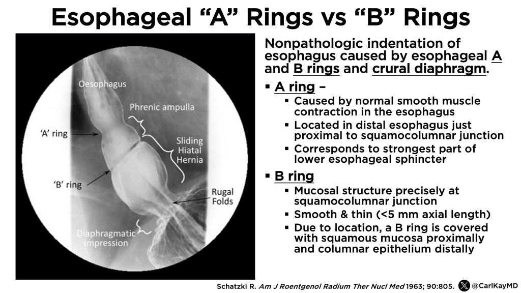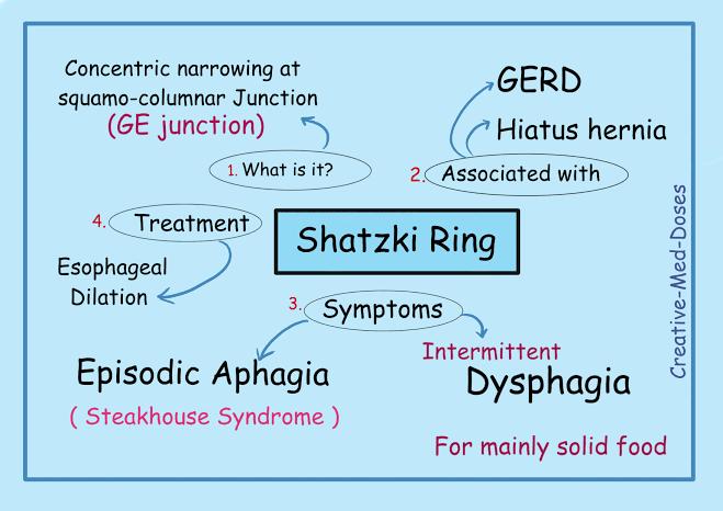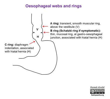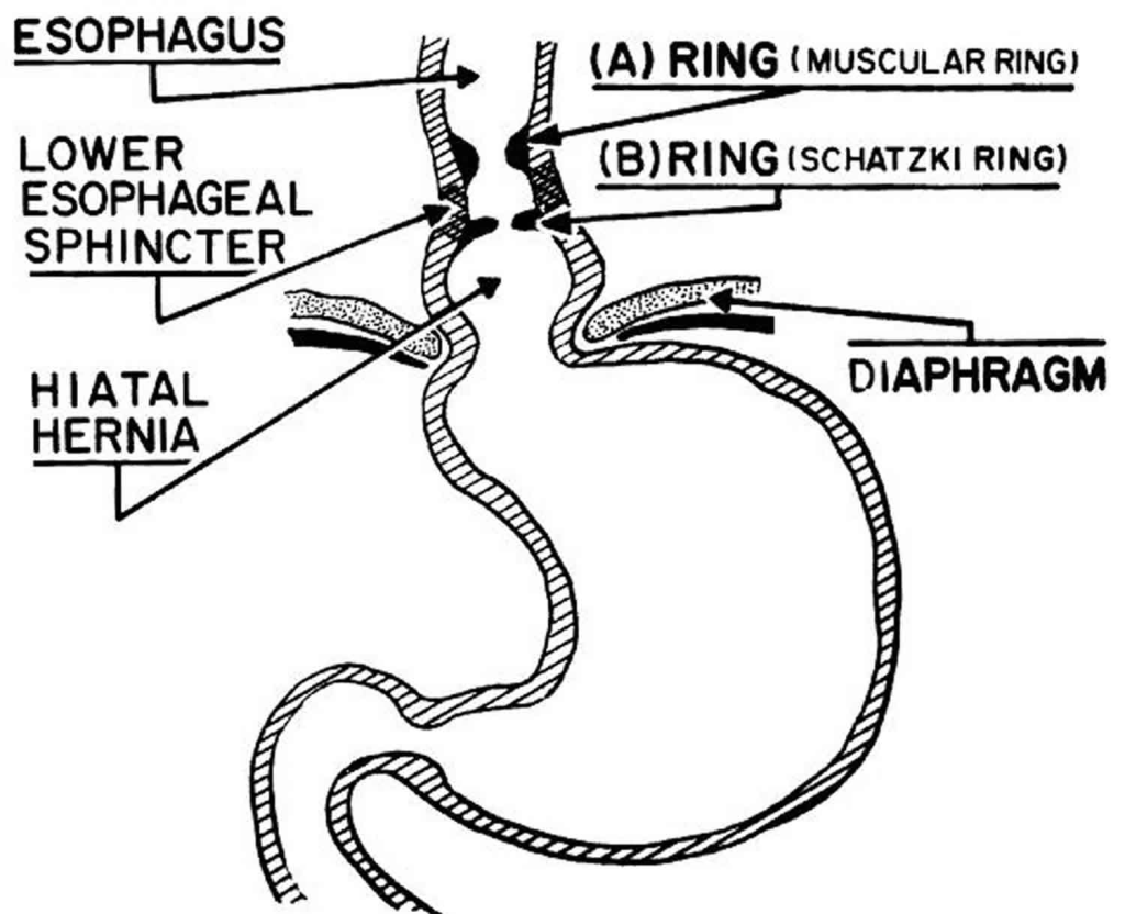 Schatzki halkası, “özofagus halkasının” spesifik bir türüdür ve Schatzki halkaları ayrıca yemek borusu / mide birleşiminin üzerindeki halkalara (A halkaları) ve alt yemek borusundaki skuamokolumnar bileşkede bulunanlara ( B halkaları).