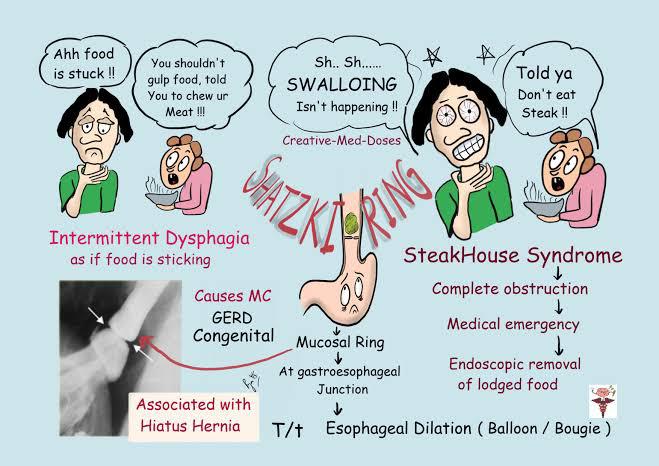 Schatzki halkaları olan hastalarda aralıklı yutma güçlüğü veya daha ciddi olarak yemek borusunun tamamen tıkanması gelişebilir . Yüzüğün adı Alman-Amerikalı doktor Richard Schatzki’den geliyor .