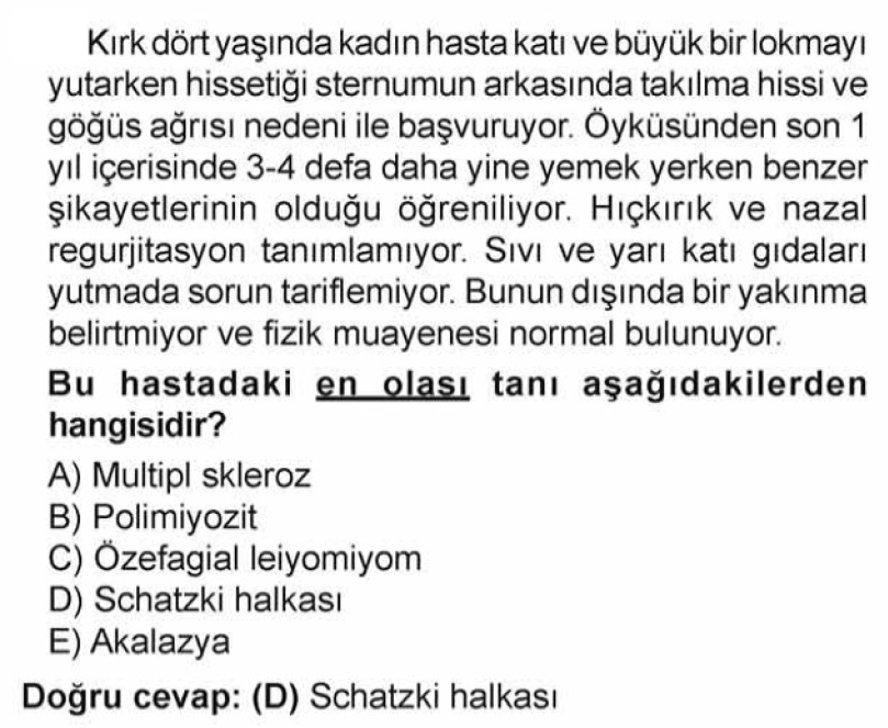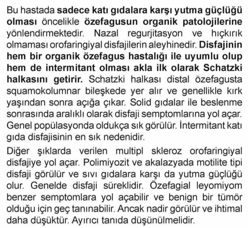 Aşağıdakilerden hangisi Schatzki ringi tanısı alan hastada beklenen semptomlar arasında yer almaz?