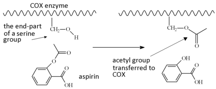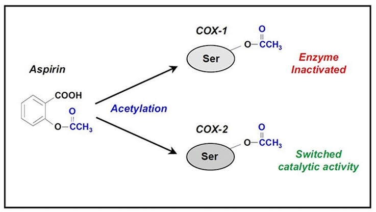 Aspirin (asetilsalisilik asit), asetil grubunun siklooksijenaz (COX) aktif bölgesindeki bir serin tortusuna transfer edilmesiyle prostaglandin (PG) sentezini inhibe eder. Ser530’un asetilasyonu, araşidonik asit substratının COX-1 izoenzimine erişimini önleyerek katalizi inhibe eder.