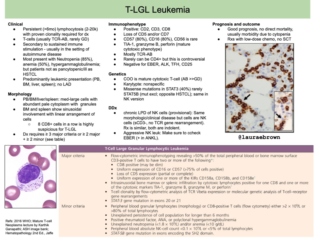 T-hücre büyük granüler lenfositik lösemi CD3+ büyük granüler lenfositlerin, agresif NK-hücre lösemi CD3- büyük granüler lenfositlerin klonal proliferasyonudur. T-hücre büyük granüler lenfositik lösemi ileri yaş hastalığıdır, kronik bir klinik seyir gösterir.