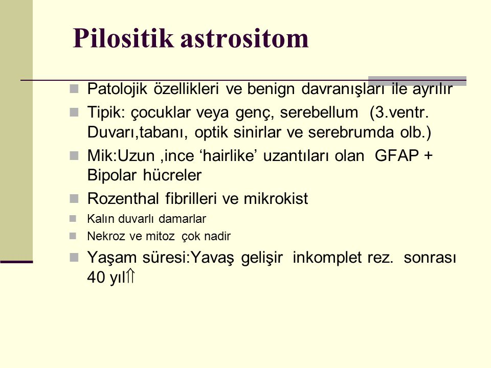 Pilositik astrositomda anaplazi (malignite) bulgusu, mitozun anlamlı artışıdır. Sağaltım, total cerrahi rezeksiyondur. Cerrahi olarak çıkarılamıyan orta hat yerleşimli tümörlerde radyoterapi