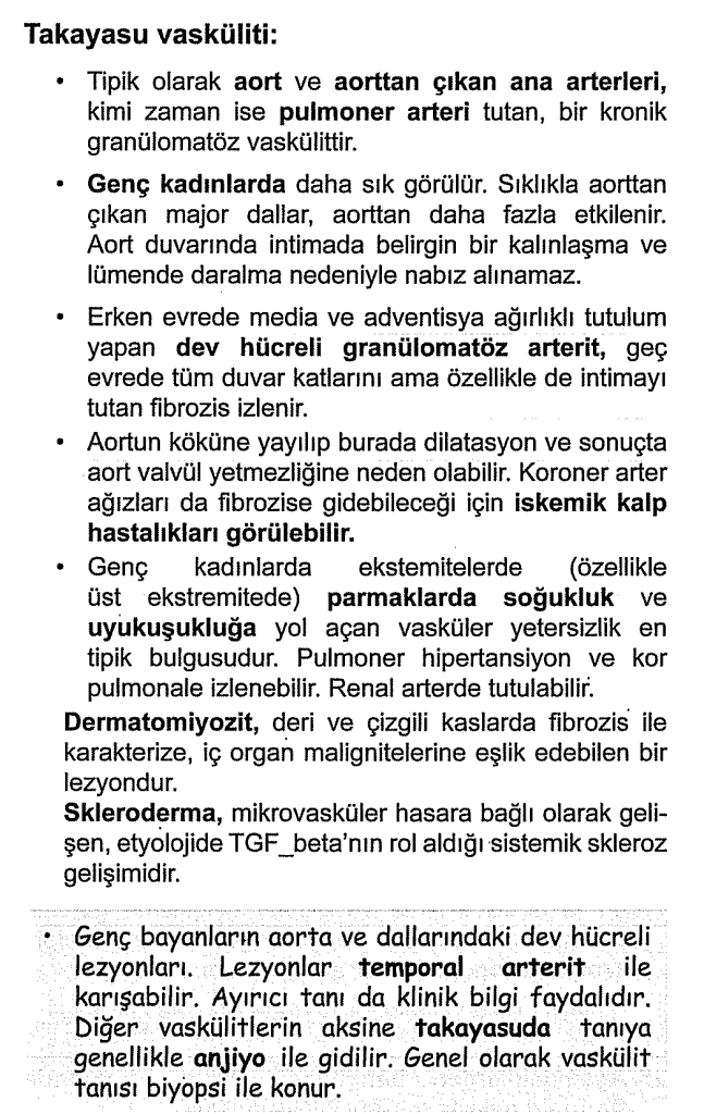 | Histoloji | Dev hücreli granülomatöz arterit; media ve adventisya tutulur, ileri dönemde fibrozis |