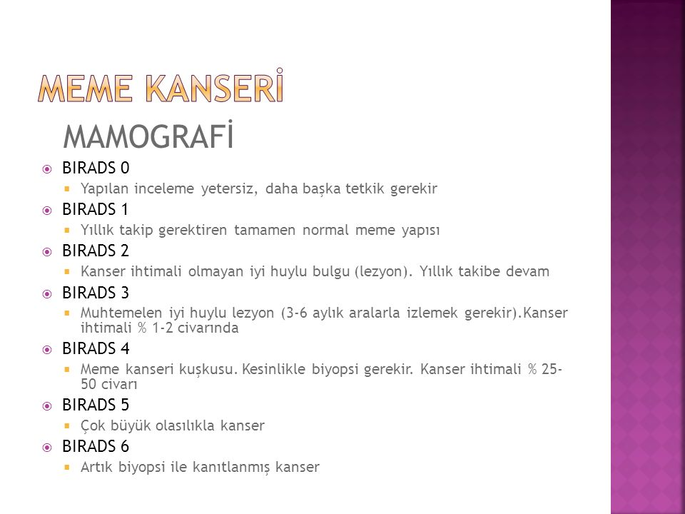 BI-RADS (Breast Imaging Reporting and Data Systems), memenin radyolojik incelemeleri sonucunda elde edilen verilen nitelikli ve doğru bir şekilde değerlendirilebilmesi ve raporlanabilmesi amacı ile kullanılmaktadır. Memede oluşan kitlenin (lezyonun) doğru bir şekilde tanımlanması, meme kanseri şüphesinin derecesi ve uygulanacak girişimsel işlemlere karar verilmesinde sistematik bir düzen oluşturulmasını sağlamaktadır.