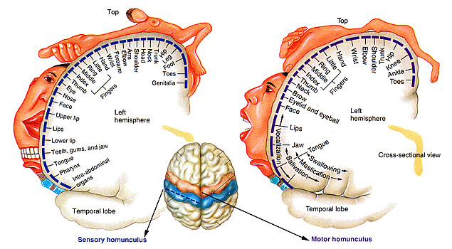 1-Motor homonkulus: Primer motor korteksteki vücut haritası, nörobilimde “homunculus” olarak adlandırılmaktadır. Bu homunculus’ta alanın boyutu, hassas motor hareket kontrolünün düzeyini göstermektedir. Örneğin, motor kortekste ayaklar, eller, ağız, dudaklar büyük bir alanı kaplamaktadır.