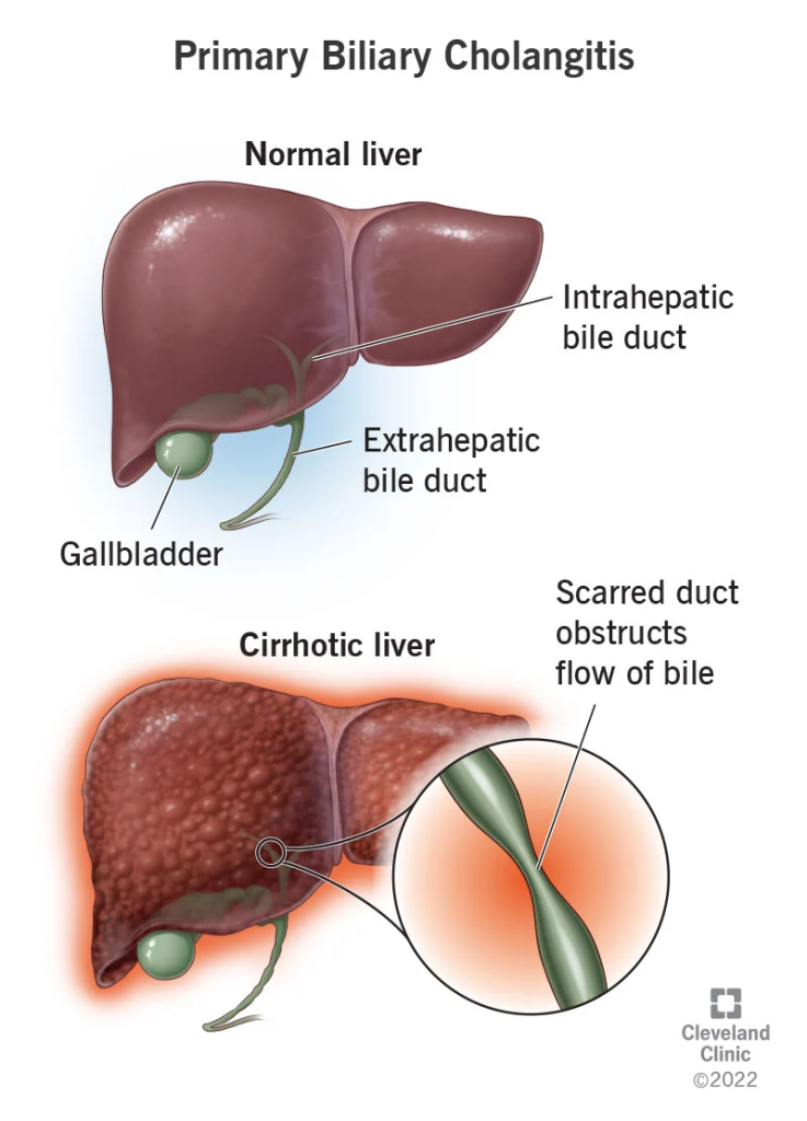 PBC’nin immünolojik bir temeli vardır ve bir otoimmün bozukluk olarak sınıflandırılır. Karaciğerin küçük safra kanallarının yavaş ve ilerleyici yıkımından kaynaklanır, intralobüler kanallar ve Hering kanalları (intrahepatik kanallar) hastalığın erken dönemlerinde etkilenir.