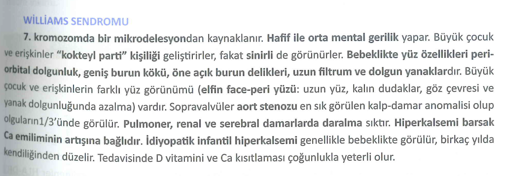Williams sendromu: ELASTİN proteinini kodlayan gen bozukluğudur. Motor mental retardasyon, neşeli kişilik yapısı, peri yüzü görüntüsü, orbital dolgunluk, yıldız şeklinde iris ve idyopatik hiperkalsemi vardır. Konjenital kalp hastalığı -supravalvüler aort stenozu görülür. Bunda pulmoner stenozda görülebilir ancak tipik kalp hastalığı suğravalvüler aort stenozudur.