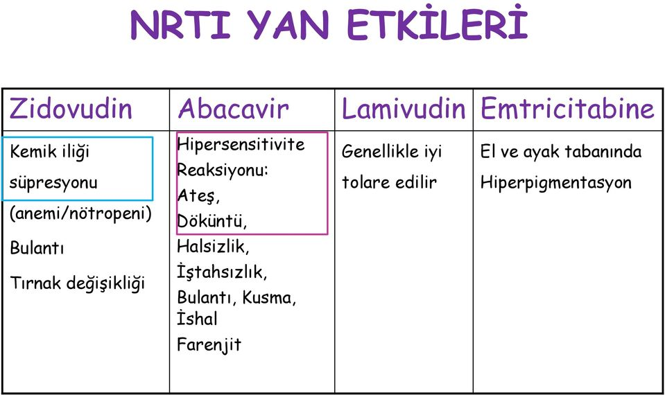 Triumeq: İçeriğinde dolutegravir (integrase inhibitor), abacavir (NRTI) ve lamivudine (NRTI) vardır.