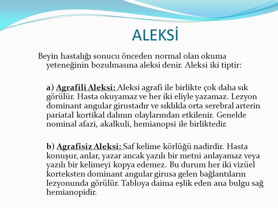 C. Agrafi Olmaksızın Aleksi (Alexia Without Agraphia) yani saf aleksi (pure alexia) genelde sol görsel korteksi ve posterior korpus kallosumu etkileyen, dil açısından başat hemisferin posterior serebral arter bölgesindeki büyük iskemik lezyonlarla ilişkilendirilen, yazma bozukluğu olmaksızın ortaya çıkan kazanılmış okuma bozukluğu.