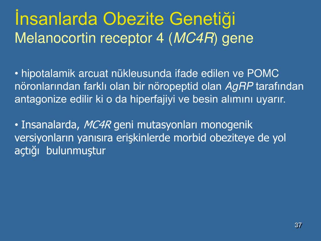 MC4R geni, en çok yaygın olan obezite genidir ve obezite olgularının % 1-4’ünü içerir. Obezitenin bu monofaktöriyel formuna neden olan gen mutasyonları, vücut ağırlık regülasyon yolağını içermekte olup tedavi amaçlı ilaç geliştirilmesinde yeni hedefler ortaya çıkarmıştır.